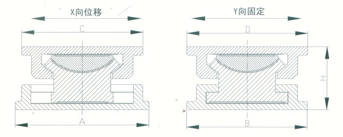 4 KBQZ系列抗拔球型支座 本系列支座主要分為抗拔球型支座和減震抗拔球型支座,下面對(duì)其進(jìn)行分類(lèi)介紹。4.1抗拔球型支座 此類(lèi)支座分為固定型、單向位移型和雙向位移型,支座結(jié)構(gòu)如圖3。其主要由支座頂板、不銹鋼板、平面聚四氟乙烯滑板、球冠襯板、球面聚四氟乙烯滑板、中支架、聚四氟乙烯滑板、不銹鋼板和滑移箱組成。支座中的相對(duì)滑移部件之間,采用目前世界上摩擦系數(shù)最低的聚四氟乙烯滑板和不銹鋼板相隔,充分減小了摩擦阻力,使各部分之間的運(yùn)動(dòng)流暢,避免爬行現(xiàn)象的產(chǎn)生。本類(lèi)支座通過(guò)球面聚四氟乙烯滑板上部構(gòu)件沿著球面相對(duì)于下部構(gòu)件的轉(zhuǎn)動(dòng)實(shí)現(xiàn)轉(zhuǎn)角(常用值為0.02rad),在工作過(guò)程中支座沿著滑移箱滑道滑動(dòng)實(shí)現(xiàn)水平位移。 豎向壓力的傳遞是通過(guò)支座頂板,不銹鋼板,平面聚四氟乙烯滑板,球冠襯板,球面聚四氟乙烯滑板,中支架,聚四氟乙烯滑板,不銹鋼板依次疊加傳至滑移箱底板。 豎向拔力的傳遞是通過(guò)支座頂板和中支架的抗拔接觸面將作用于支座頂板上的上.拔力傳至中支架,再由中支架與滑移箱之間的抗拔四氟滑板和不銹鋼板將力傳至滑移箱頂板。 水平力的傳遞是通過(guò)支座頂板側(cè)壁與中支架側(cè)壁之間.的接觸面將水平力傳至中支架,再由中支架與滑移箱的接觸面?zhèn)髦粱葡鋫?cè)壁根部。 固定型抗拔球型支座不設(shè)滑移箱。4.1.1普通抗拔雙向位移型球型支座KBQZ-SX普通抗拔雙向位移型球型支座參數(shù)表 表74.1.2普通抗拔單向位移型球型支座KBQZ-DX普通抗拔單向位移型球型支座參數(shù)表 表84.1.3普通抗拔固定型球型支座KBQZ-GD普通抗拔固定型球型支座選用參數(shù)表 表9
